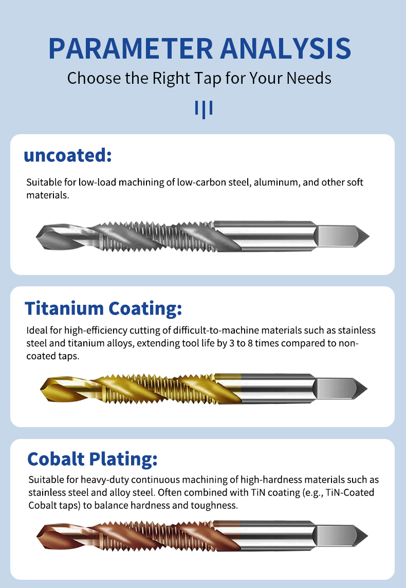 Design estrutural: A parte frontal apresenta uma ponta de perfuração (para uma rápida penetração no material), a secção intermédia possui uma aresta de corte (para um alargamento preciso do furo) e a haste tem uma forma de rosca (para roscagem direta). Estas três secções trabalham em sinergia para conseguir uma maquinação contínua.