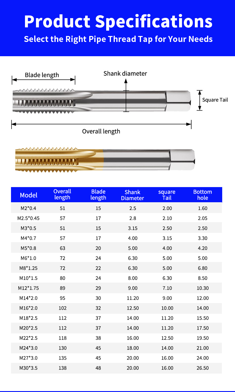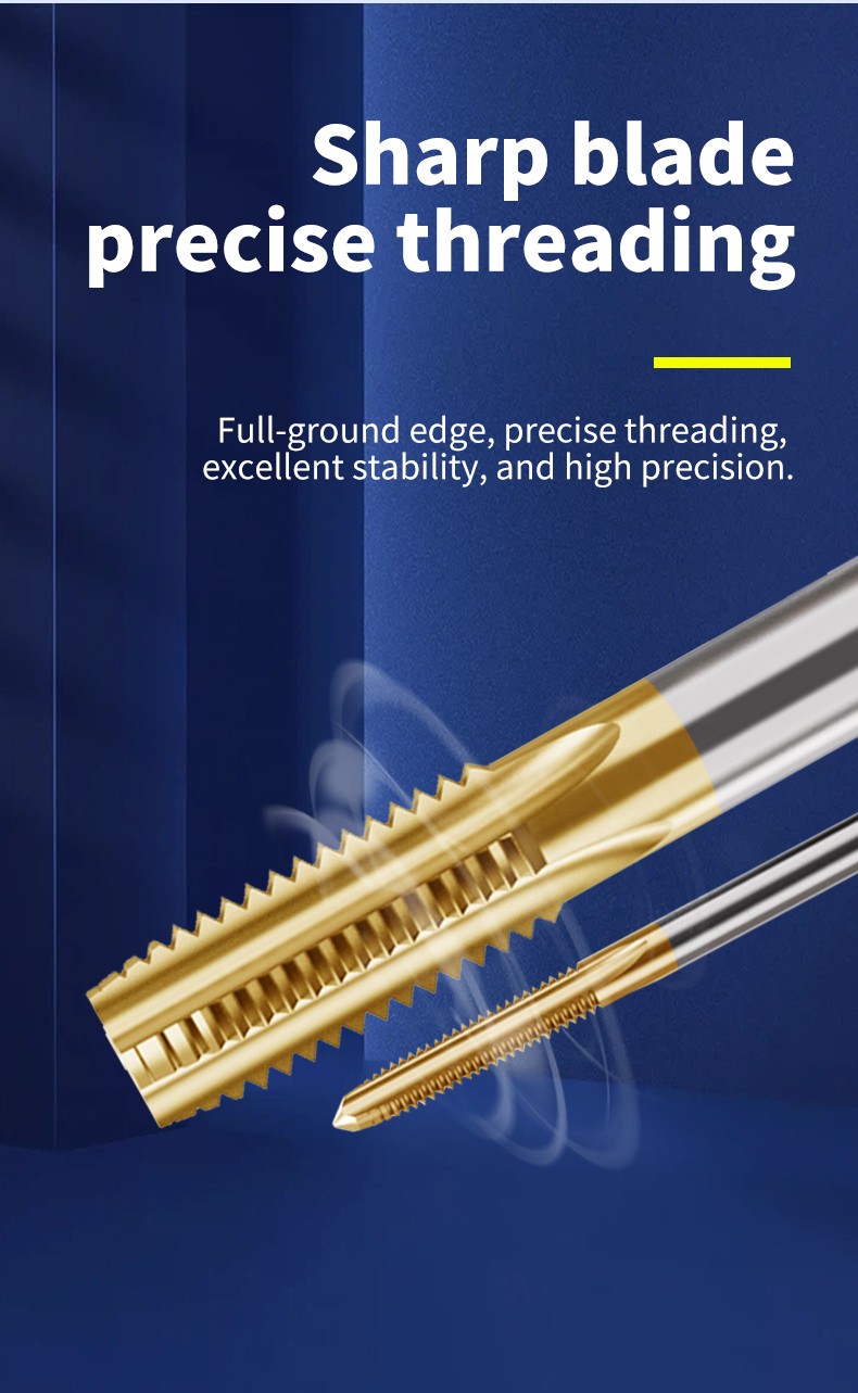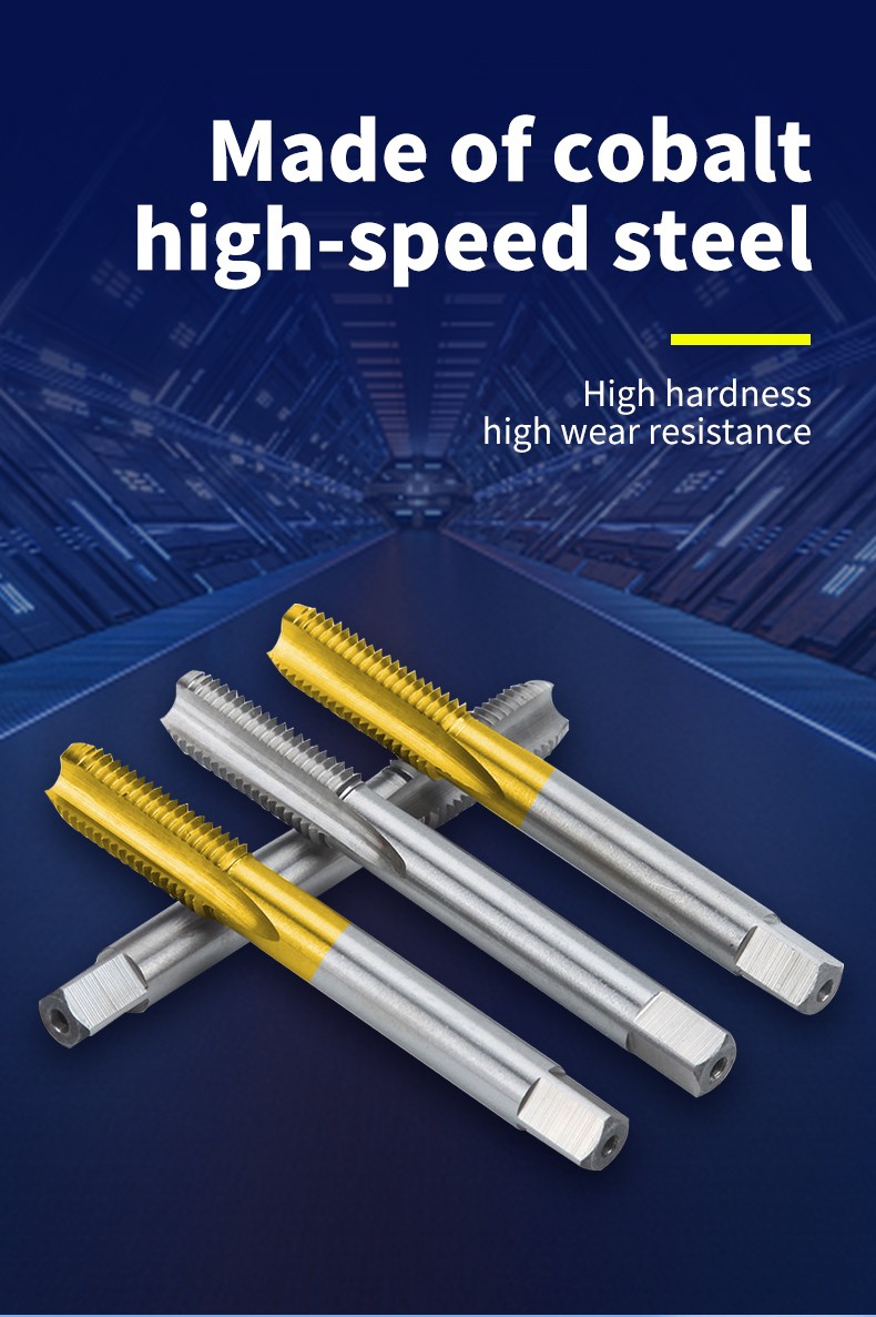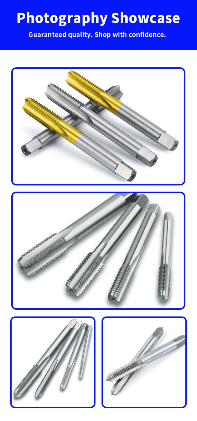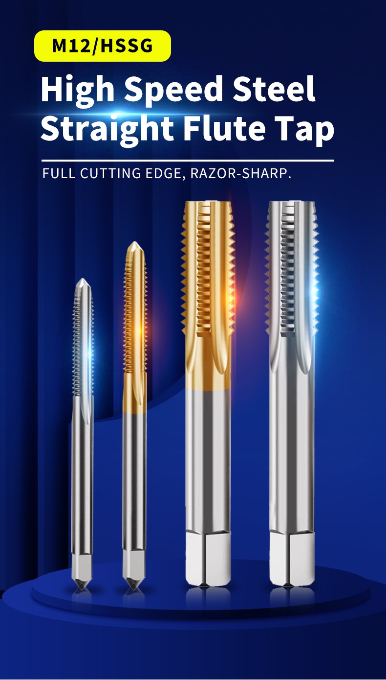 Machos de roscar de canal reto em aço rápido HSS, tamanhos M3-M12, com revestimento em titânio, para roscas métricas; ferramentas de roscagem CNC em aço rápido HSS-E para aço inoxidável.